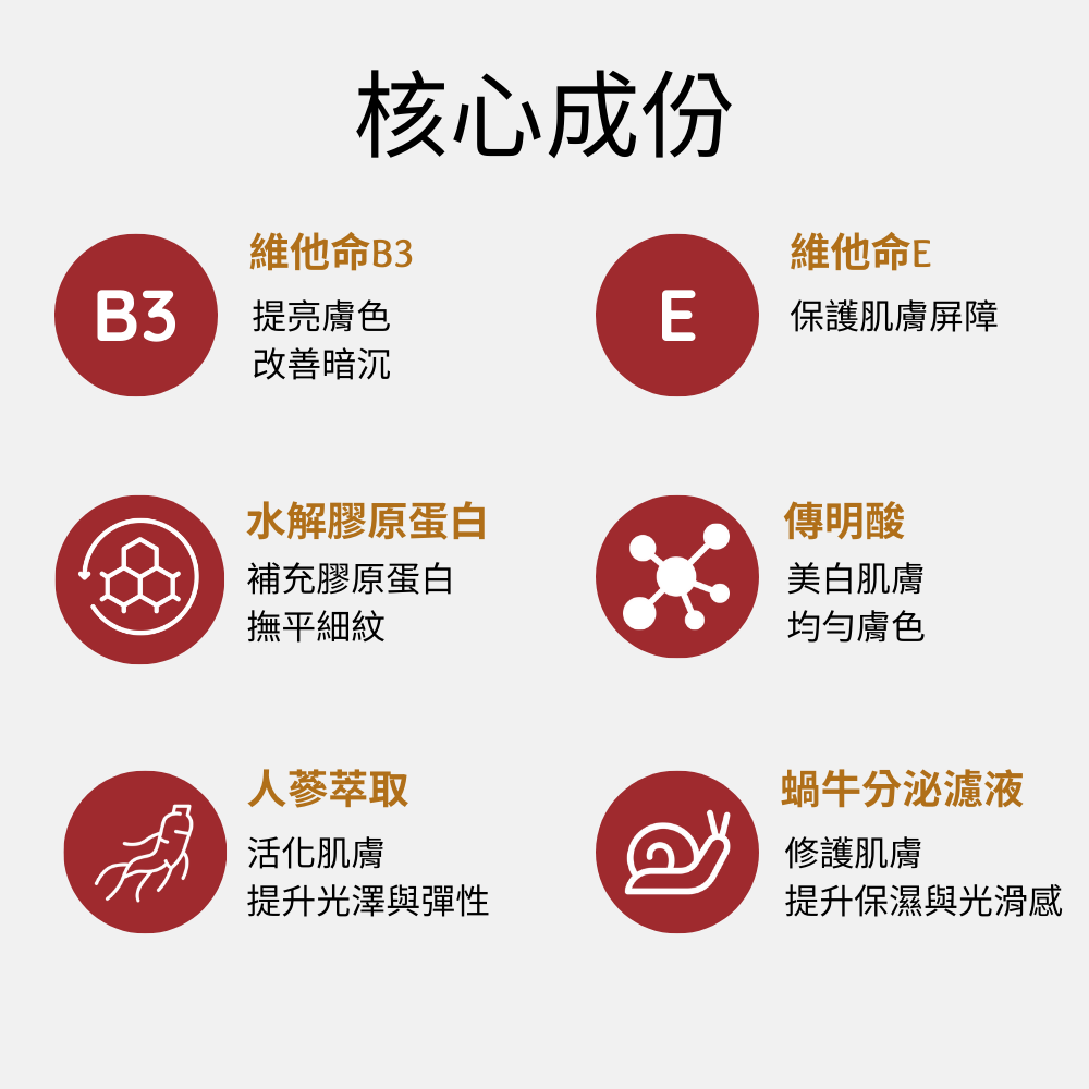 AQUA, PANAX GINSENG EXTRACT, HYDROLYZED COLLAGEN, BUTYROSPERMUM PARKII BUTTER, PETROLATUM, NIACINAMIDE, OCTADECYL HEPTANOATE, DIMETHICONE, DIMETHICONE/VINYL DIMETHICONE CROSSPOLYMER, GLYCERIN, ERYTHRITOL, TOCOPHERYL ACETATE, TITANIUM DIOXIDE, SODIUM POLYACRYLATE, TRANEXAMIC ACID, PHENOXYETHANOL, HYDROGENATED POLYDECENE, FRAGRANCE, ISONONYL ISONONANOATE, GLYCERYL OLEATE, COCO-CAPRYLATE, DICAPRYLYL ETHER, CYCLOPENTASILOXANE, TRIDECETH-6, SNAIL SECRETION FILTRATE, ETHYLHEXYLGLYCERIN, SODIUM SURFACTIN, BUTYLENE GLYCOL, ALUMINUM HYDROXIDE, XANTHAN GUM, TRIETHOXYCAPRYLYLSILANE, ETHYL HEXANEDIOL, 1,2-HEXANEDIOL, DISODIUM EDTA, CAPRYLYL GLYCOL, HEXYLENE GLYCOL