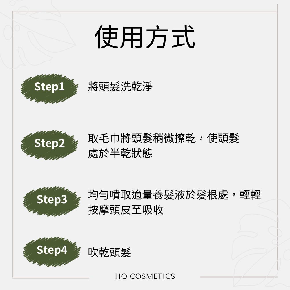 用 法:於洗髮後頭髮未吹乾前,噴取適量養髮液於髮根處,輕輕按摩頭皮至吸收,然後吹乾頭髮即可,每週可使用3-5次。